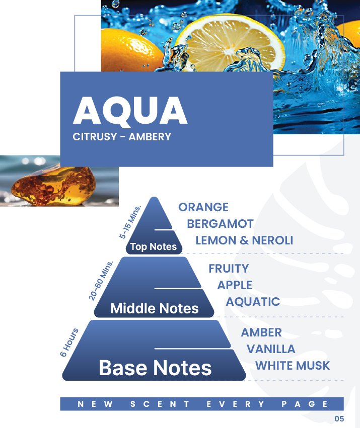 Dive into the refreshing essence of Scentabook’s Aqua aroma oil, blending invigorating Citrusy zest with the warm embrace of Ambery undertones. Transport yourself to a serene oceanic paradise, revitalizing your senses with every breath.