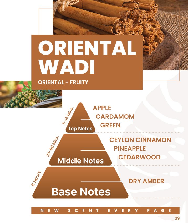 Discover the captivating allure of Oriental Wadi aroma oil from Scentabook, blending the exotic richness of oriental notes with the playful sweetness of fruity accents. Immerse yourself in a sensory journey that transports you to distant lands, where lush orchards meet ancient spice markets. Crafted with precision, Oriental Wadi aroma oil infuses any space with an enchanting aroma that stimulates the senses and ignites the imagination. Elevate your surroundings with this irresistible fragrance, perfect for enhancing relaxation and rejuvenation. Experience the mystique of Oriental Wadi today!