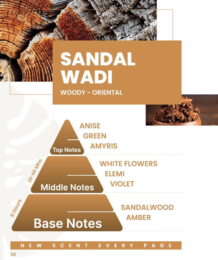 Experience the allure of Sandal Wadi aroma oil from ScentaBook. With its enchanting blend of Oriental and Woody notes, Sandal Wadi transports you to a realm of tranquility and sophistication. Infuse your space with the rich, earthy aroma, perfect for creating a serene atmosphere in any room of your home. Elevate your senses and unwind in luxury with Sandal Wadi aroma oil.