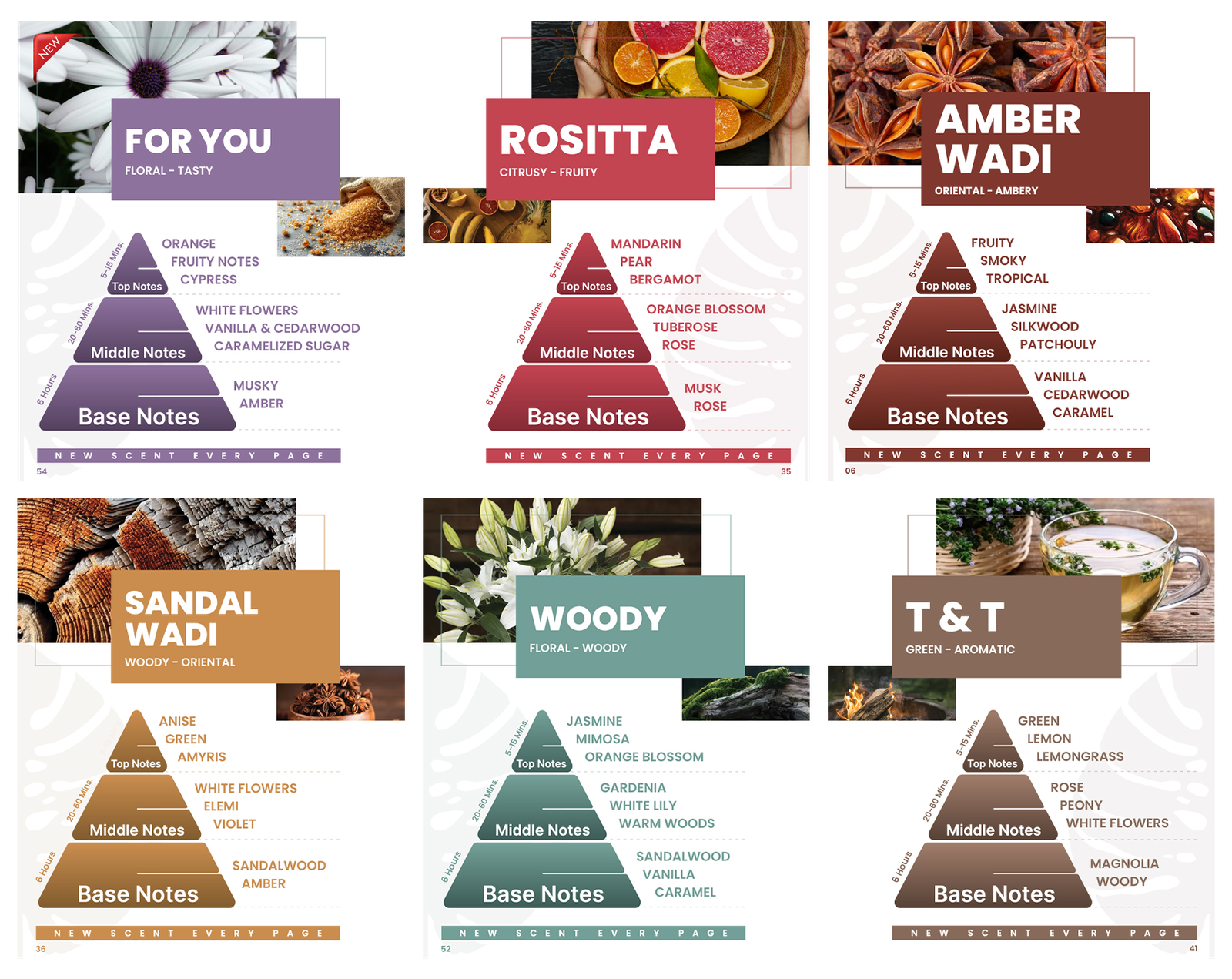 – Sandal Wadi: a smooth, woody fragrance that brings a touch of sophistication.