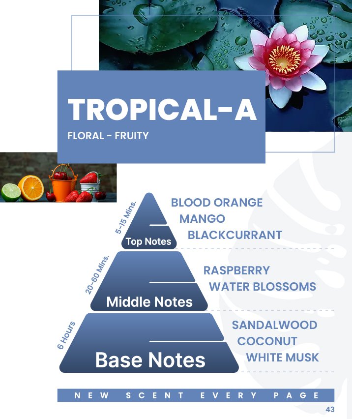 Infuse your home with the exotic scent of Tropical-A aroma oil, perfect for bedrooms, living rooms, and sunrooms. Its floral and fruity notes create a refreshing ambiance, ideal for enhancing relaxation or brightening up any space with a tropical flair.